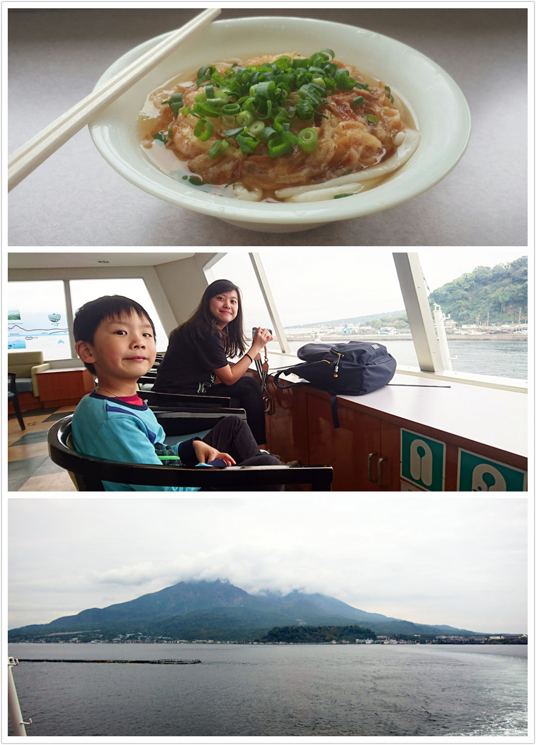 行李留在酒店,我們先去空港巴士站買定車票,然後出發去櫻島。坐在渡輪上面向著海,真的很舒服。買了船上的紀念品後,敵不過烏冬的香味,也買了兩碗天婦羅烏冬吃(因為只懂講Tempura Udon XD)。十五分鐘的船程,急急吃下烏冬便上岸。